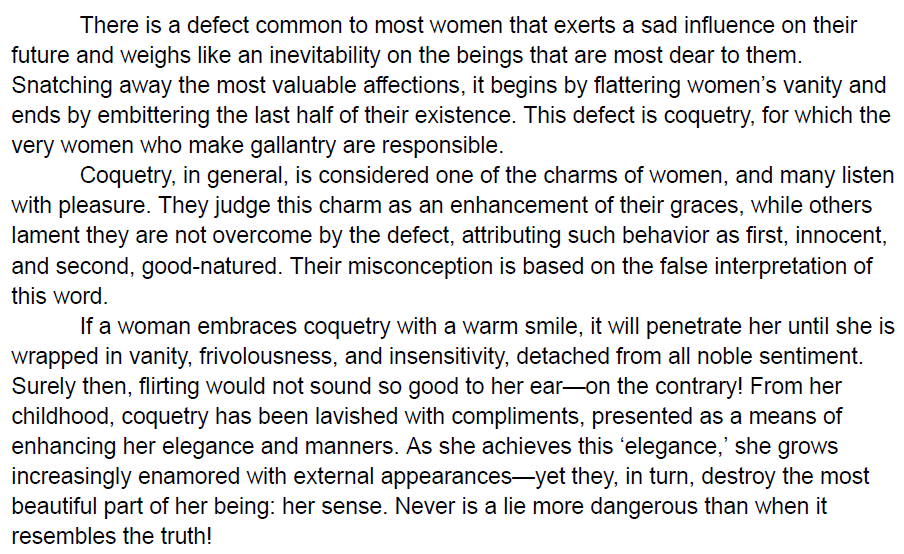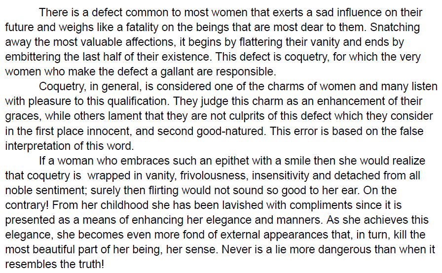 R. Grayson worked as an English literary consultant with Spanish translator Sarah Turner to refine raw English translations and excerpts of Joaquina García-Balmaseda’s commentary on the state of Women’s Education and Coquetry in her native country of Spain. García-Balmaseda, a Spanish contemporary of Mary Wollstonecraft and Jane Austen, wrote in Early Modern academic Spanish, which required etymological finesse and the use of antiquated 18th-century English to preserve the essence of her voice and tone without compromising her message or intent. The project required 646 edits, a selection of which are showcased below.